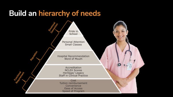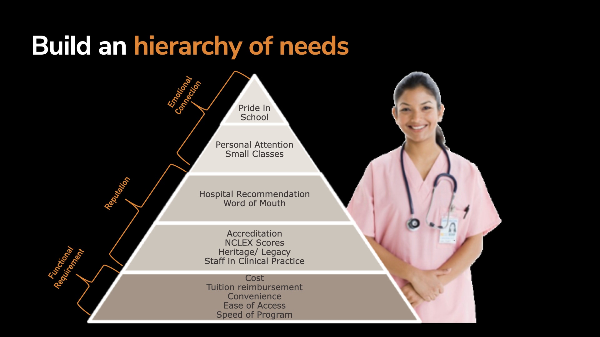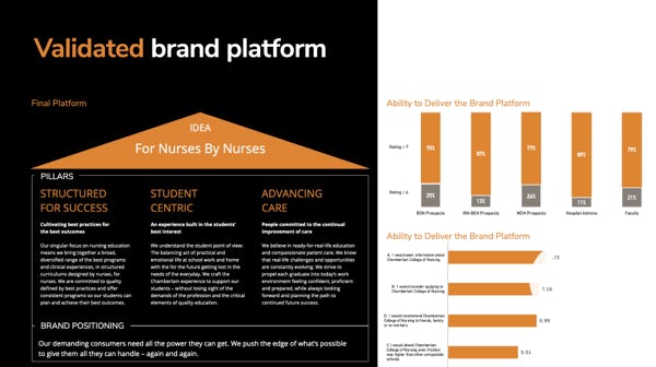 The strong visual connection to actual nurses reinforced the sense of duty and calling while minimizing a sales organization perception in admissions. Since the brand positioning exercise the footprint has grown from 4 campuses in the Midwest to 22 nationwide.