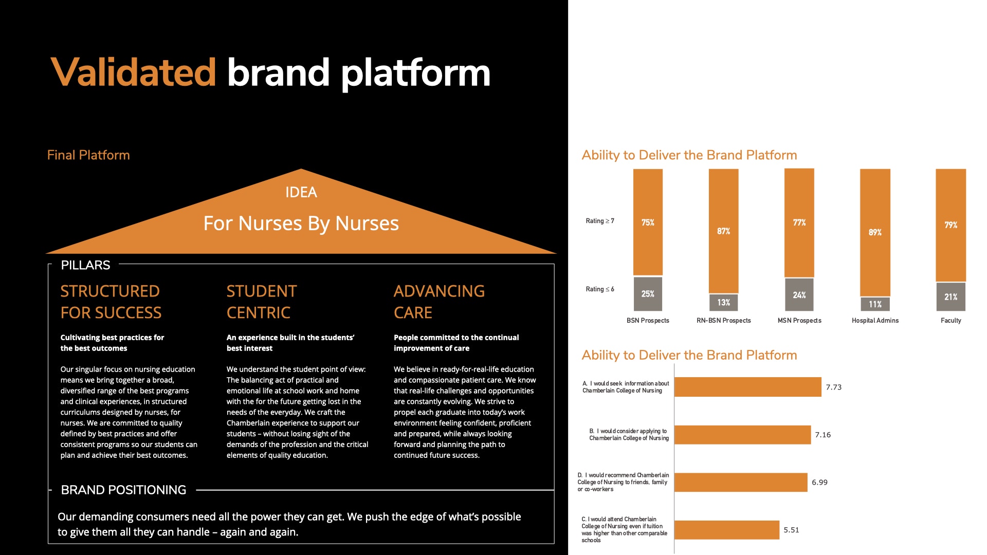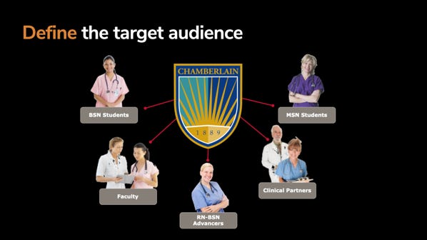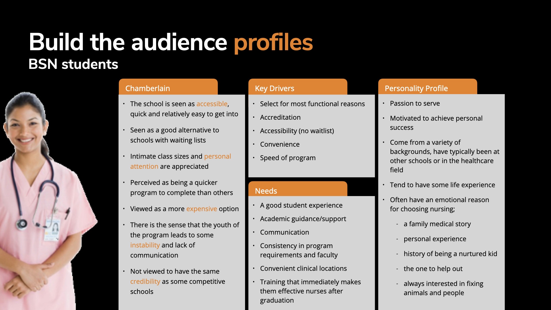 After conducting qualitative research in Columbus and Chicago, we validated our hypothesis that students choose a nursing school primarily for functional reasons and that the supply-demand imbalance in most markets has meant that brand has rarely had to play a role. To own a space in the category the ideas of student centricity and a singular focus would take the Chamberlain brand in a more emotionally impassioned and differentiated direction.