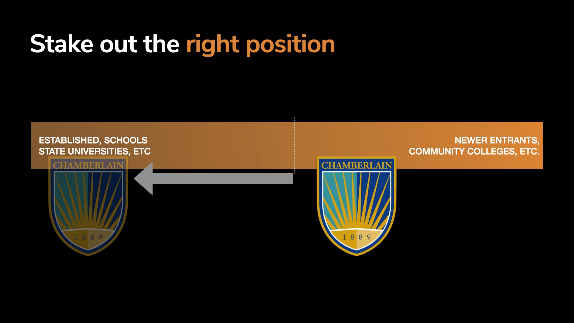 Also, the Chamberlain seal emphasizes a long, established history but at the same time puts the brand in a position of over-promising and under-delivering. In rapid growth mode the school would be evolving, and in some cases developing, the structure, talent, faculty and culture. Calibrating a clear vision and expectations with room for iterative improvements would be a necessary requirement to meet.